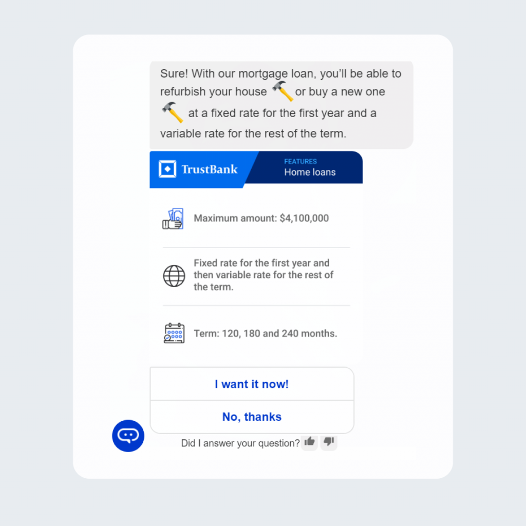 Certain questions cannot be easily answered by generic instructions from the bot. Examples of these include card termination or taking out a mortgage loan.